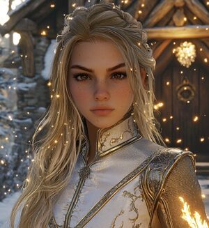 In the year 450, she was the fortunate winner of the Taisidon Mystery Raffle and is the proud owner of a Faelight_leather_satchel_pinned_with_a_dour_goldenrod_ismenite_unicorn . It contained a Dawnfire steel bracer set with a unicorn spinel traced in glowing truegold, a Wing-flared dawnfire steel shield symbolically enwreathed in unicorn spinels and her prized Gleaming dawnfire steel broadsword. She often travels the realms on her ethereal white-winged unicorn with truegold regalia and a glowing horn of light, which is fitting as she follows the Immortal Hodierna. Her beliefs were influenced by Wild Magic and the subsequent attacks by the Heralds. She was heavily involved in triage in their eventual defeat. Witnessing the Immortals in action defending the Realms forever changed her life.